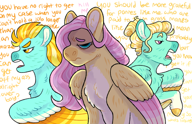 "...Okay. I...I'm coming," Mild Glow replied, her terrified voice barely above a whisper in the wind. A moment of hesitance was followed by a deep breath. Then what was supposed to be a jump off the cloud turned into a slip accompanied by a yelp. She haphazardly tumbled through the air about as gracefully as a penguin being thrown from a skyscraper, and the cry she let out was just as bad.