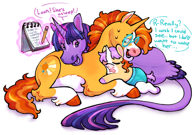 It had taken all afternoon to get up to the clouds, since Derpy Hooves wasn't a great flier herself. Twilight hadn't been able to come along (no matter how much she wanted too) since she herself doubted her own skills with her wings. In fact, she was so worried about Mild Glow's ability to fly being hindered by their ineptitude she was about ready to get Rainbow Dash to teach their kid for them. But then she remembered all the crashes, collisions, and collateral damage that her friend had been causing all of her life and thought better of it. Although Derpy could technically fall in the same boat, she had noticed her lovely wife's newfound carefulness around their child."Alright, kiddo, it's your turn!" Derpy spread her wings and jumped off of their cloud to flap in midair. "It's not that hard, huh? And if you feel yourself start to fall, don't worry, I've gotcha!" She showed a genuine smile back up to her kid....who was quivering like they were in a snowstorm. "...Glow?"