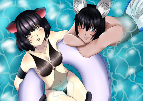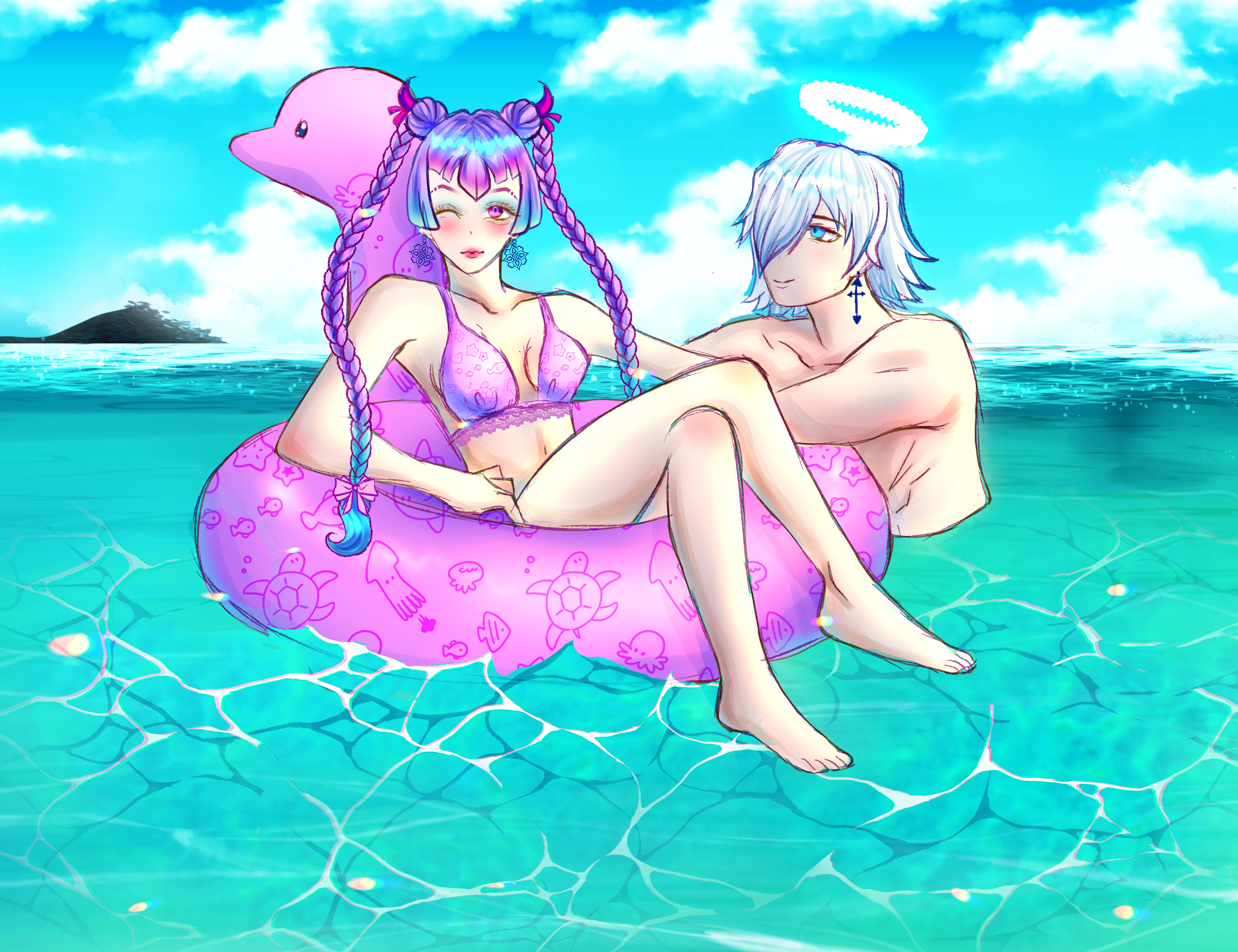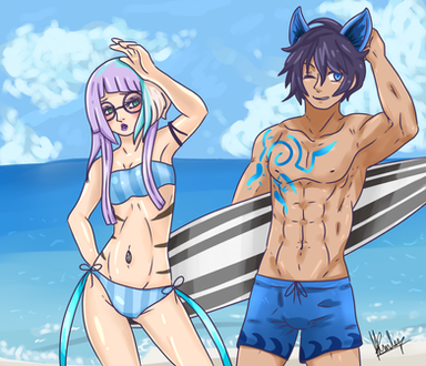Hello! It's really hot where I am so I thought of this beach scene.I had fun drawing the characters for this one! I tried to paint this one instead of using my usual style.