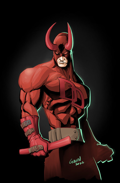 This is brilliant, I especially like the background - it has captured the image of what we would expect hell to be like, but it creates this without losing the feeling of it being a mysterious place. As for Daredevil - I really like your unique spin on him. It's nice to see artists like you take an idea and make it their own. You've definitely succeeded in making him more monstrous, but not a complete monster. The balance between the monster and human qualities are clearly illustrated in the face. The horns combined with the human skin and the friendly smile creates the perfect unity. Hope to see more pieces like this from you in the near future.