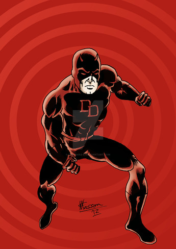 DareDEVIL was sketched and inked by hand and coloured with coloured pencils. The background was quickly knocked up in Photoshop.