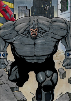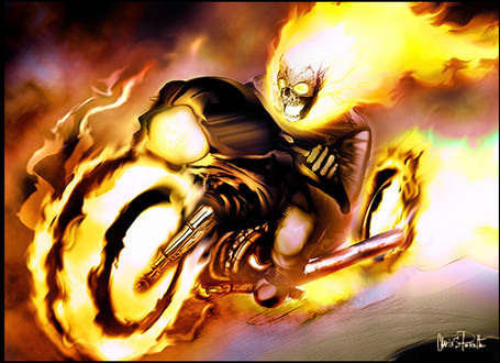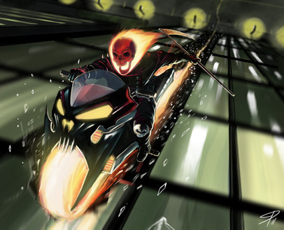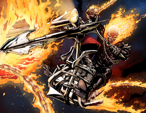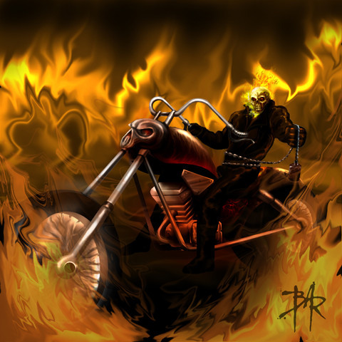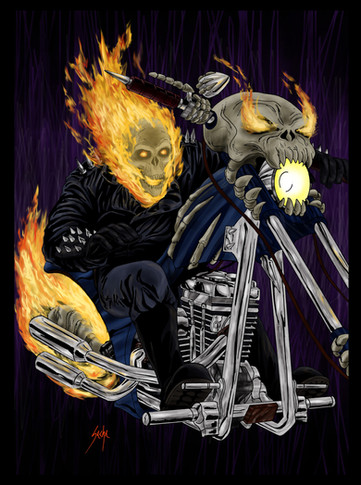 Very cool. I love the way you've played with the proportions on GR, making him this hulking mass of leather atop which the flaming skull sits... Very poetic. Also jives great with the chopper he's on.