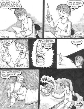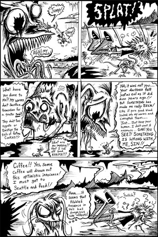 the first page of my fight with my own characters. This was done as a filler thing for my comic [link] which is now on hiatus. Evil hiatus!It was going to just be a one-pager, but I liked it and had more ideas.