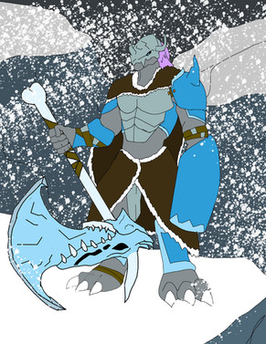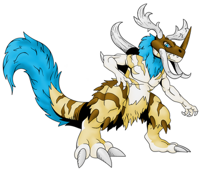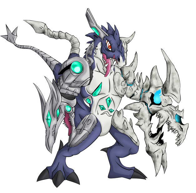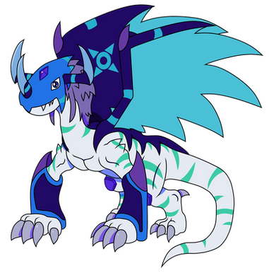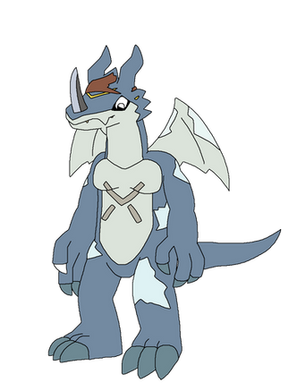 this is what I imagen if a snowagumon Digivolved into a Greymon variant.Do to the frigid environment it develop ice like structures on its body that is harder than most metals like iron, steel and copper. It uses the ice on his teal as a sword/ spear like a weapon. Do to the fact that it can no longer berth fire it had developed the ability to berth blizzard like winds.