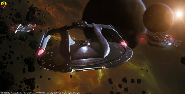 I only design the backgrounds (that is, planets, nebulas, etc. etc.). Unfortunately I have no clue how to use those 3D-programs, so I have to use ships from other images (which I then credit), and usually I slightly edit the ships. In this case, I tried adding some additional shadow / lighting on the Intrepid class, and I edited the colour balance on both (more blue-cyanish), using Photoshop.