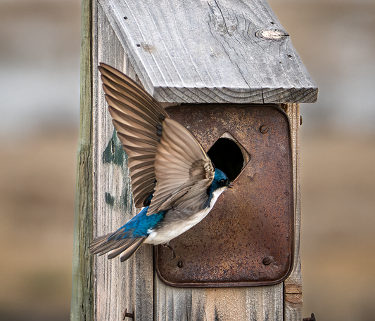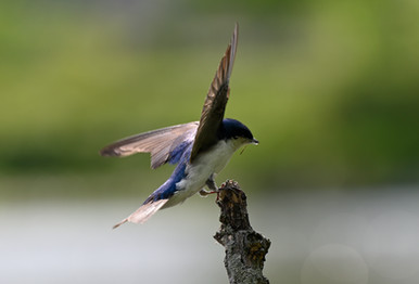 A Tree Swallow stretching out its wings a bit before launching off the post to make a run for some bugs in the air.