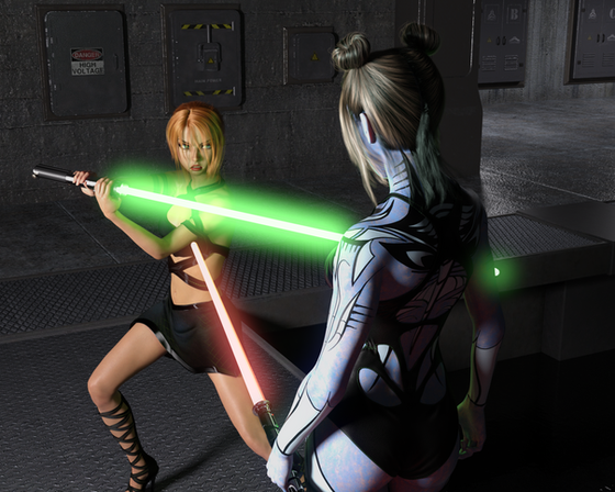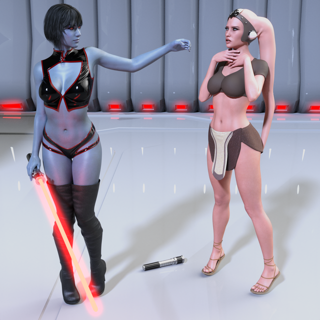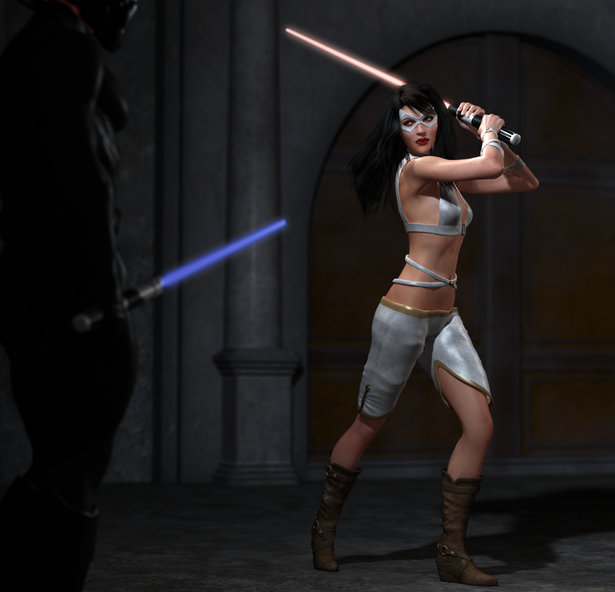 That’s really cool! Using the force on her hehe. Sexy outfits as usual. Il love the pose of the Jedi in the background too very heroic