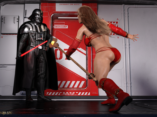The sexy Sith lady uses her force choke powers she learnt from Lord Vader to interrogate the rebel ships crew, if they didn't give her what she wanted then they died, their necks snapping in a quick twisting motion, as she was choking this particular troublesome young lady officer she heard the lift door open and stood in the doorway, highlighted by the lifts bright lights was the sexy Jedi knight she had been looking for