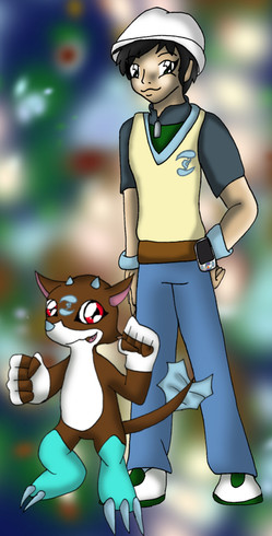 The second digimon is the In-training level, Hokumon. Hoku is the Japanese onomatopoeia, or imitative word, for when you pop something hot in your mouth, and mutter "hoku hoku" to express how hot it is.