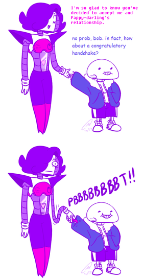 Oh wait, I remember you now! You were the deviant who used the filthy frank meme incorrectly in response to my papyton drawing. Wait, then your comment makes even less sense now. Why would you put your trust in a papyton shipper if you yourself do not ship papyton. If we were talking about apposing opinions in something like moral beliefs or politics, then that would make some sort of sense, but not for a couple of video game characters.