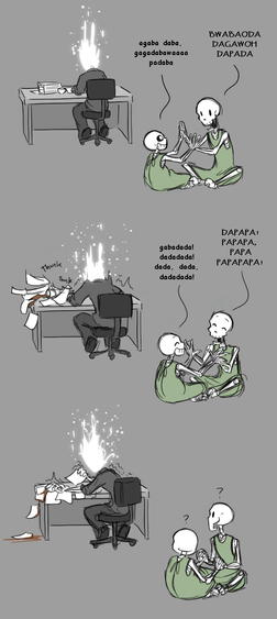 LIVE FROM THE PAPYTON TRASH CANBaby and skele-daddy have a riveting conversation while dad-bot records the whole thing with his bff to share with his fan club.
