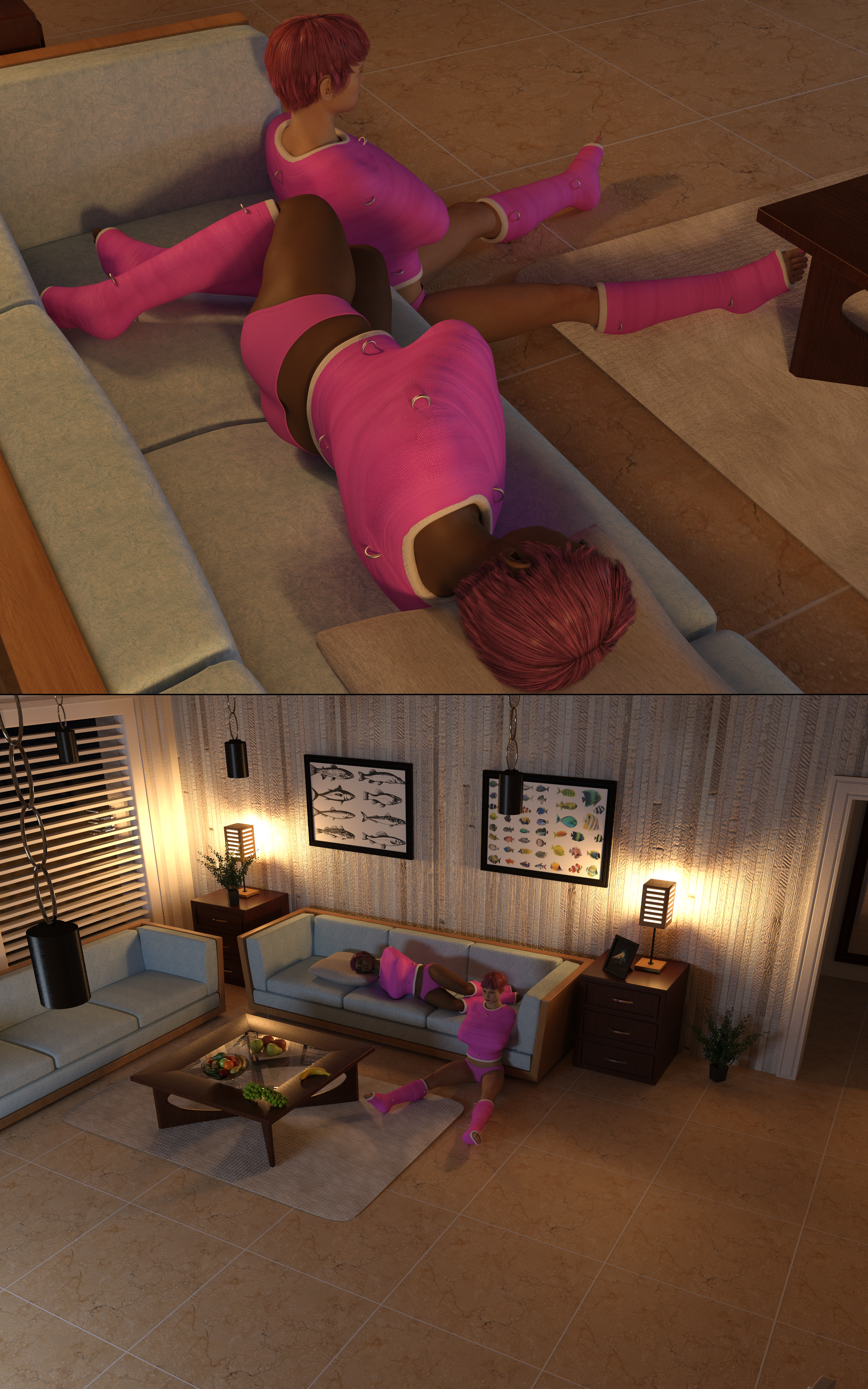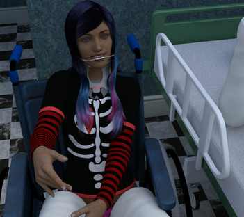 I went back and forth a few times with the story before deciding to post this version. I thought of the general outline of the story a while ago (involuntarily committed, indefinitely restrained in casts with a child-like pattern on the casting tape, as part of forced age regression therapy), then rendered the picture, then wrote the full version of the story. I'm still undecided about how much detail I should have added; it feels wrong to get any pleasure out of a situation involving severe mental health issues and suicide attempts. These are not things to take lightly -- but nothing else really fit with the premise that I had in mind. At very least I wanted to make it clear that her acting out was more of a cry for help than actual self-destruction, and that this really is intended to help her instead of just being a twist on a "kinky asylum" fantasy. Maybe that makes it worse; I don't know.