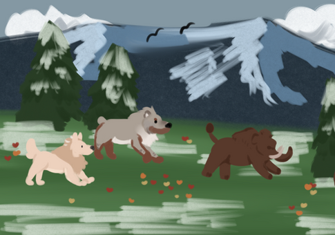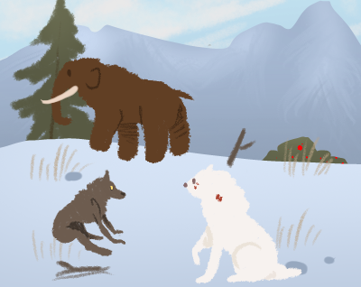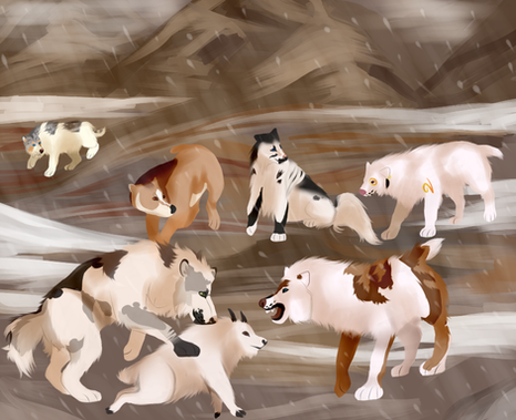 A young caribou walked onto the scene, curiously and warily looking around. All the Tokota's immediately got into hunter mode, getting low and staring at the caribou. They would then act like they were not interested by looking away and around the caribou instead of straight at it to not raise any suspicion. The caribou was already kind of out of place, waltzing onto the scene with six Tokota's. Amarok was not very interested though, relaxing in the sun lazily. Padme, Valkryja, Selich, Thranduil, and Teddy were in focus mode. They began to slowly manevuer towards it. You could almost see them drooling. Then an unfamiliar Tokota came onto the scene, walking up the caribou without it so much as flinching.