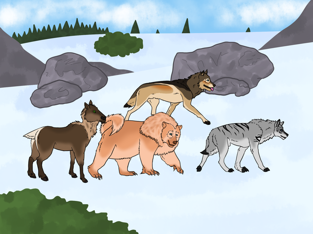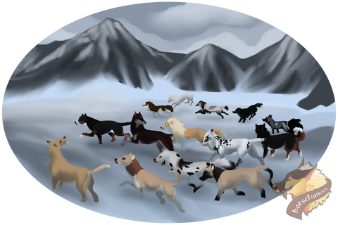 Maverick exhibited playful behavior, galloping around the meadow happily as he and the rest of his pack members anticipated the hunt that they were about to leave to. Killian lay down nearby, rolling her eyes at the all too playful pup along with Sage who was interested in watching rather than participating. Maverick knew his place in the pack, so he did not attempt to get any of them to play with him. Instead, he would bug Little Dipper who was younger and more playful than the others and was more than happy to a little play here and there. Amarok trotted onto the scene, eyeing the now two playing pups before snorting and sitting near Killian. Reina and the handler, David, came onto the scene. Reina was not too happy with this stranger but she was very interested in the hunt, rather excited even so as long as this David character did not bother her or try to interact with her, she would be fine. David called for the group, mounting atop Amarok who allowed him to do so and began leading the way. The rest of the pack behind them trotted in a single file line, nobody stepping out of line despite the shere amount of excitement hunting trips brought, especially when they were on the way to hunt mountain goat which could prove to be good opponent considering they were prey items and such. The group trotted up the mountain at a good pace, the wind pressing against their faces and fur. Sage's curly and longer fur was very wavey in the wind, she looked rather majestic. Once in the mountains, around the zone where the mountain goats resided, they split up a bit in search of scent clues that would lead them to their desired prey. It wasn't long before Killian sparked up with something, alerting the group with low toned growls and prancing around her spot. They all gathered around, busily sniffing around where Killian had found and deciding to head up towards the area where the scent was leading them. They became more excited now, running ahead impatiently. Maverick whined lowly and Killian growled, snapping at his face in punishment. He was not able to be loud right now- he would ruin their hunt and Killian would beat him up essentaily. Finally, they spotted the goat herd. The goats were casually grazing on the limited mountains grass and the minerals in the rocks. Reina licked her jaws obsessively, wide eyes following the members of the herd as they walked around. The group would split up from there, fanning out to create a secure hunting circle around the herd which would ensure no goat could easily escape and give the hunters more of a success chance at their hunt. Killian and Amarok waited for everyone to get into the position before springing from their positions and immediately creating havoc on the goat numbers. They hooved creatures scattered in a mess of white fur and bleating mindlessly. The rest of the hunting party would slowly start to show themselves as goats got too close to the sides of the circle they had created, popping out to scare the goat in the other direction. They would close in to tighten the circle in unity, working together very well despite their differences. Killian spotted a particular goat attempting to escape in an open zone and she instantly charged forwards towards it, sprinting to gain enough speed to catch up and cut the goat off from the safety of the steeper ledges. She bodyslammed the goat while running next to it, forcing it to trip over and in the fall it badly injured it's ankle before falling off a fall of quite a few feet. At the bottom, blood could be seen leaving the goats mouth and other injuries around it's body. Killian flagged her tail, pleased with the almost effortless kill before hopping down to claim her reward proudly. Above, Maverick and Dippy harassed a goat down, forcing it to submit as it grew tired and exhausted from the tireless Tokota's chase. It bowed down on a knee in defeat, panting heavily as it took it's last few gasps of air. The two played with the goat before actually killing it, causing the poor thing to suffer more than it should. Reina and Sage looked around for a goat calling their name. It wasn't long before a loud bleating goat was spotted racing around in the confusion, hitting corner and just looking overall lost and confused. They took this advantage without protest, trotting towards the goat with their heads lowered, looking for some way to safely attack the goat. The goat was bleating and kicking before it saw the two, in which it attempted to charge forward towards them. The two easy split up and came from behind, grabbing and throwing the goat to the ground. Easy.
