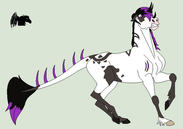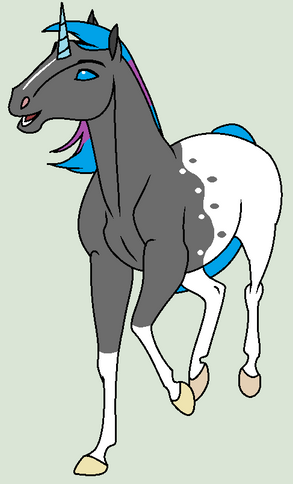 ~True Form: Blue, Black, and white with a light grey and white mane and tail with teal eyes