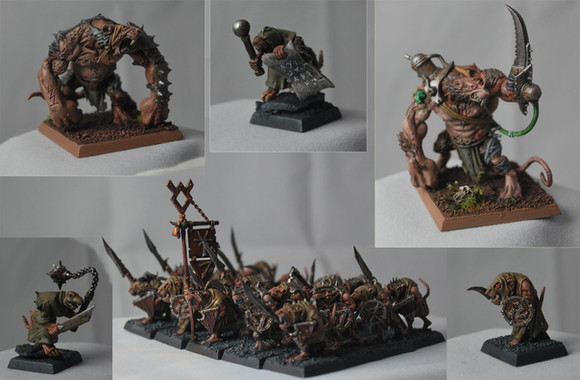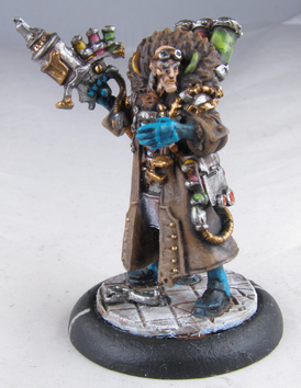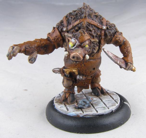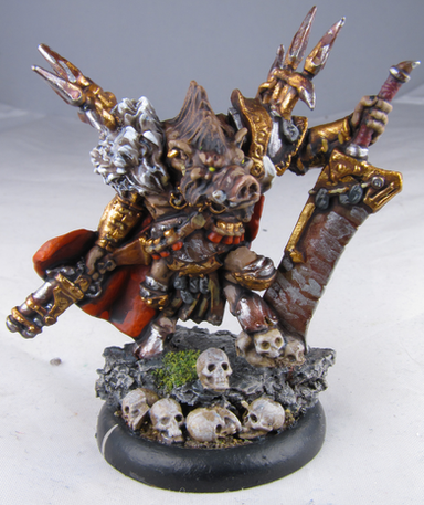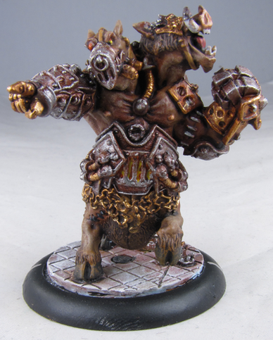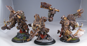 Even before the arrival of Dr. Arkadius, the farrow used lesser pigs as beasts of war. These boars, crudely armored and fed on the flesh of other sentient beings, are used as ravenous shock troops, unleashed in frenzied packs to crash into enemy ranks. These creatures are indiscriminate in their appetites, and will gladly feast on their own when one of them falls. The farrow care little what happens to them, so long as they distract and harry their foes long enough for their troops and larger warbeasts to get into position.I actually have eight of these zany little pigs, but I did them in batches, which means that these three work as representatives of the whole. They were stupid easy to paint, and they look hilarious on the tabletop as they zip around and squeal into battle. They've been the unsung heroes in many of my games. No one expects to have to deal with five to eight of these little guys, which can do a lot of damage while they distract my opponents.