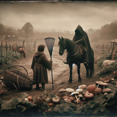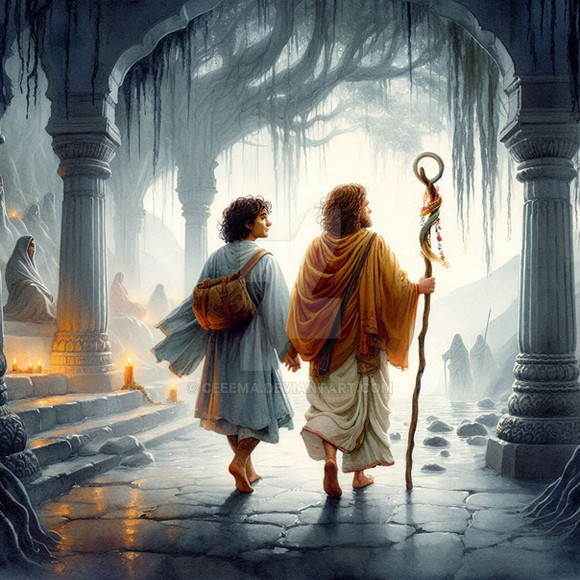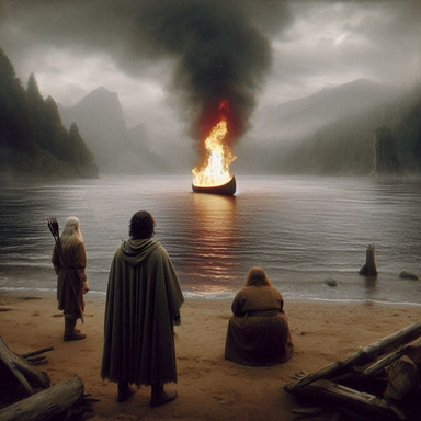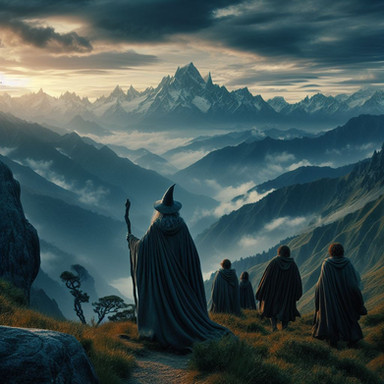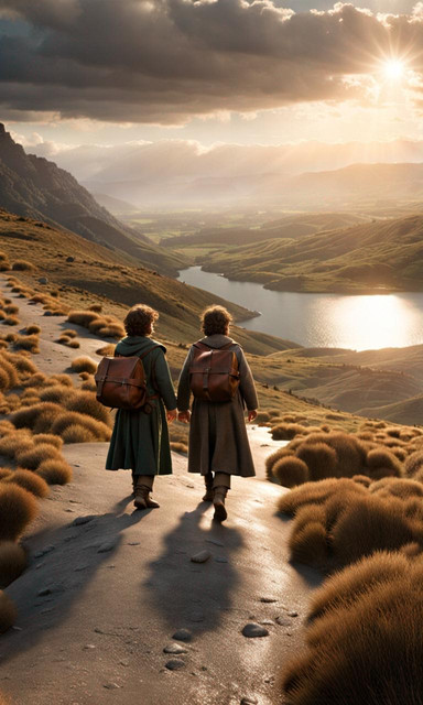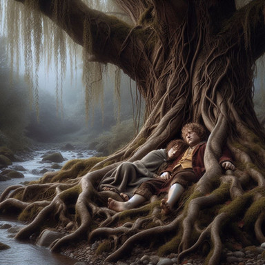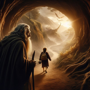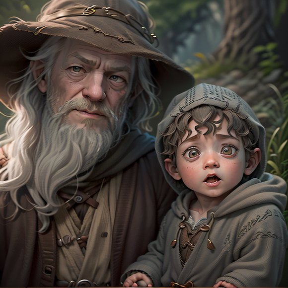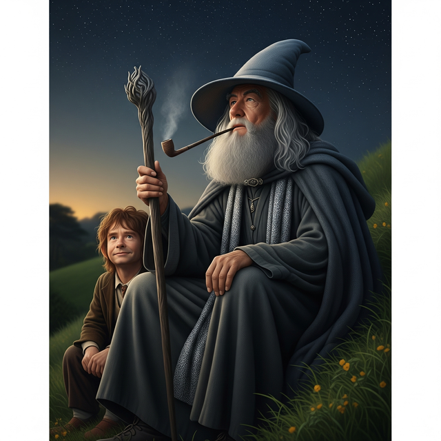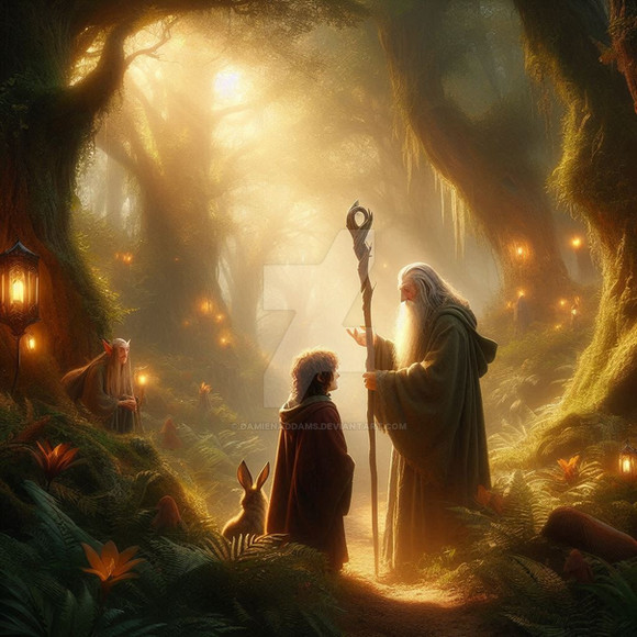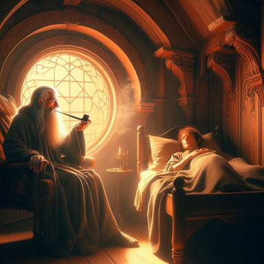 Since Frodo wore the ring, it prolonged his lifespan. Many decades later while in the Gray Havens, Gandalf (the hobbit whisperer) broaches the idea to Frodo of becoming a wizard apprentice...[Bing Image Creator]