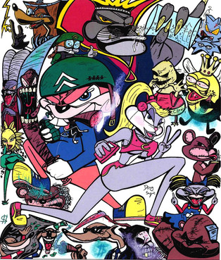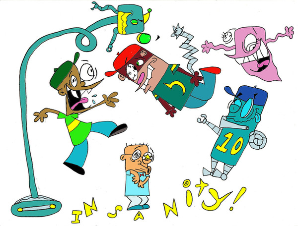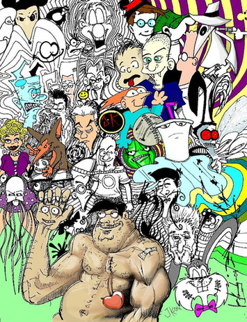 With all these new characters I'm coming up with I figured I should at least draw them all a second time. So I'm going to do a weekly pic featuring all the characters I came up with for that week.First up, Ted the happy zombie, Almost Naked Girl, Beaver-Man, Invisible Goat, Fishboy, Couch Potato and the oh-so evil Lollipop Lady.