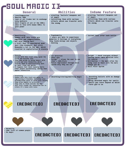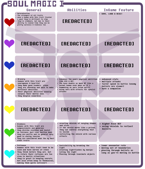 Okay now comes a small explainy bit. You see the traits are divided in Main and Minor traits. The main traits are the original traits while the minor ones are the new ones. They are minor cause they are way weaker than the main traits [still more powerful than monster SOULs tho] . 3 minor souls would equal the power of one main trait soul. Also Love/Compassion which is the monster SOUL technically doesn't belong into the chart cause humans don't have that trait, but this chart is still from a time were monsters and humans lived together, so it was natural to count them in to the minor traits.