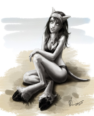 Ah, those poofs on her legs and tail, they look so soft <3 I just adore that odd expression as she pushes her hair up, it looks bizarrely cute xD