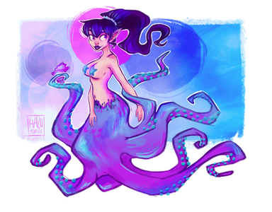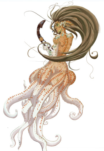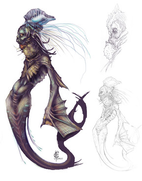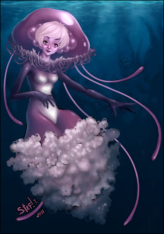 Very interesting concept! Your soft painting style is always nice to see, I especially like the gills and the bulbs growing out of her shoulders/arms/tail