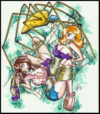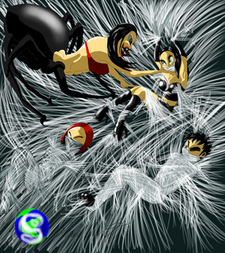 This is perfect! I love Bee Girl's wide eyes and terrified expression. The web looks really cool and Spidella is hot stuff.
