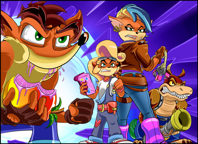 I wanted to include both new and old favourites here. Not the exact CTR poster I envisioned but I wanted to do it as soon as I laid the sketch of Crash down :3 I wanted this one to be more cel-shaded, and with more saturated colours, like some of my older Crash pics.