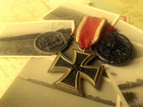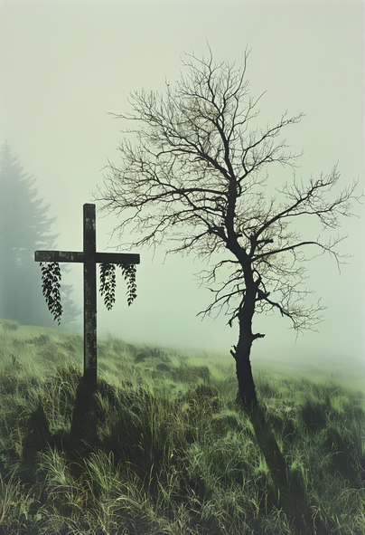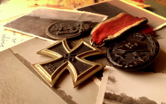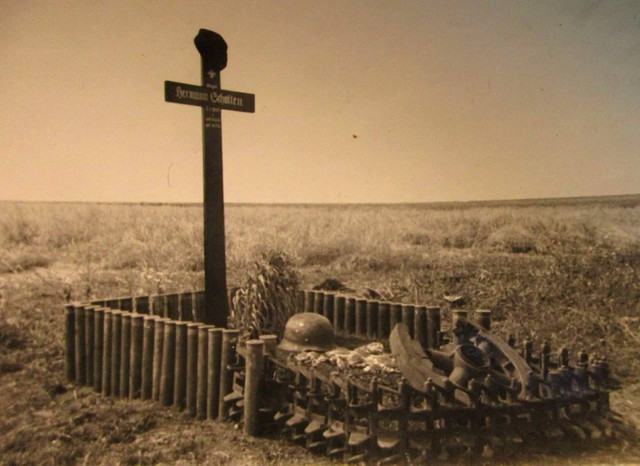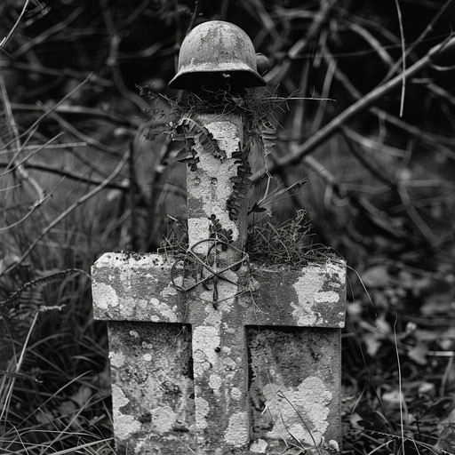 A crude birchwood cross, toppled by a battle-damaged helmet, stands as mute testimony to a dead German soldier.Related content