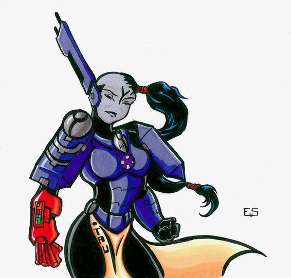While I agree with the creator that the lower plates should probably have been a different colour to help them stand out from the shoulder-pauldrons, it's really just a minor knit-pick that doesn't bring down the whole piece. Overall it's exactly what I've come to expect from your work, and nothing wrong with that Very nice shading, especially on the red gemstones, really gives them that smooth polished stone look. Plus the "muscle" texture of the black undersuit brings a lot of life to the piece.