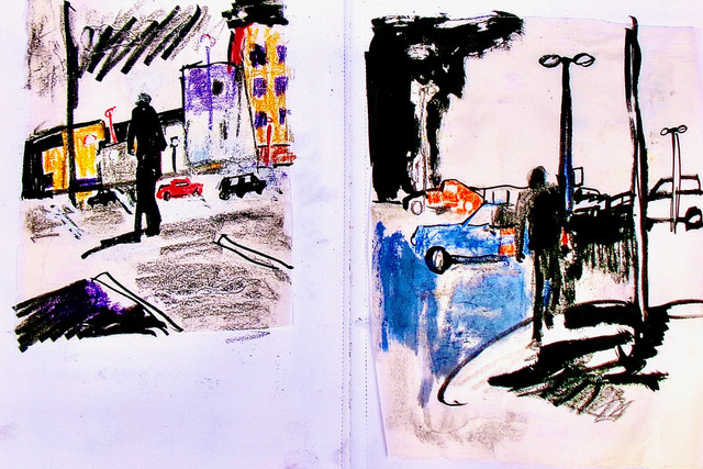 #black #dancing #drawing #figures #image #landscape #paint #painting #people #picture #rain #raining #reflections #road #street #streetview #sunset #umbrella #umbrellas #watercolor #white #iumage