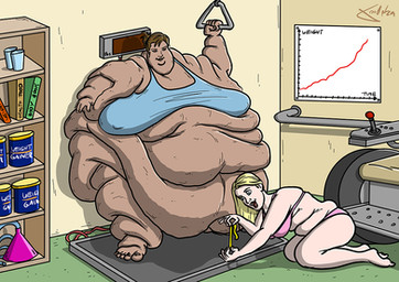 Robzilla44 posted the comment, “Can’t wait for your next impossible mound of blubber!” in a recent entry. I liked that phrase, “impossible mound of blubber”, so I went digging through the archives to see if I had one hanging around. There was nothing finished, but I found a rough draft of the above drawing and went to work. It’s based on a loose sketch I did a while ago called “Big Gal in Bed” that’s in the gallery, if you’re interested. I changed the details a bit in this polished piece, such as moving the scene to a different location…because you know you’ve got a serious feedee on your hands when she asks to have the bed moved into the kitchen just so she can be closer to the food.The insatiably greedy amongst you might claim that “she’s not really an impossible mound” or “she could be even fatter”, and you’re correct. At the moment, though, it’s all the mound I can muster.