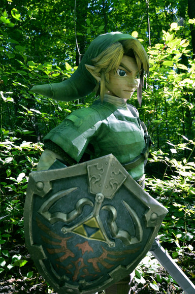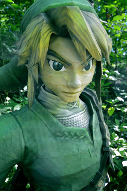 Link is a life size papercraft model standing around 5'5. He is made completely from 250 gsm paper (about 4x stronger then normal paper). He has foam core supports in the top and bottom of his pants, top and bottom of his boots and a ring in his waist. There is also some in the back of his shield, and in the handle of the master sword.He can be easily unassembled for transportation. His head, torso, legs, sword, shield, and sheath are all separate. The sword can also be put into the sheath. He can stand all on his own without any support.