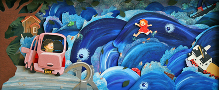 Aww. ; w; I really like how the car is determinedly driving through the water. Nice colours. <3