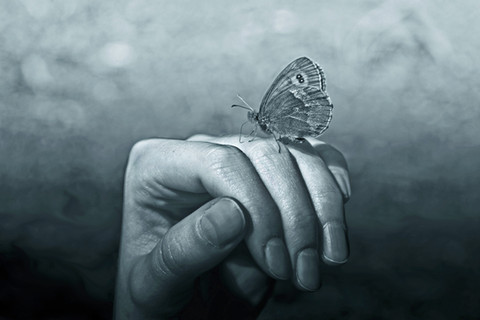 Stunning simplicity, and powerful. A modern St Francis? The bird is looking at him, not for food. Connection, indeed.