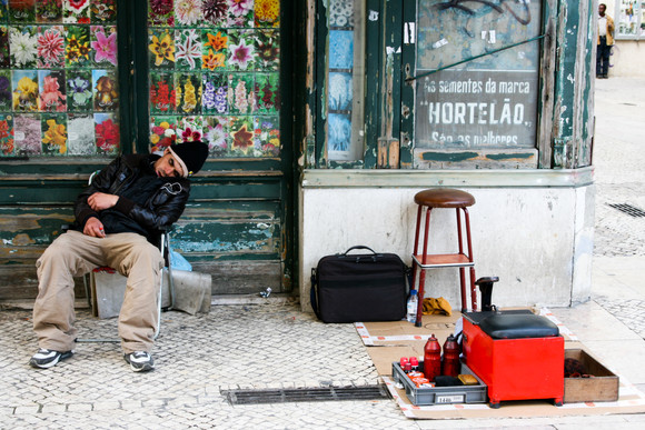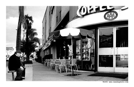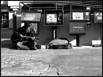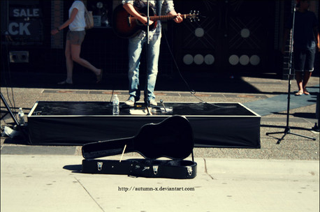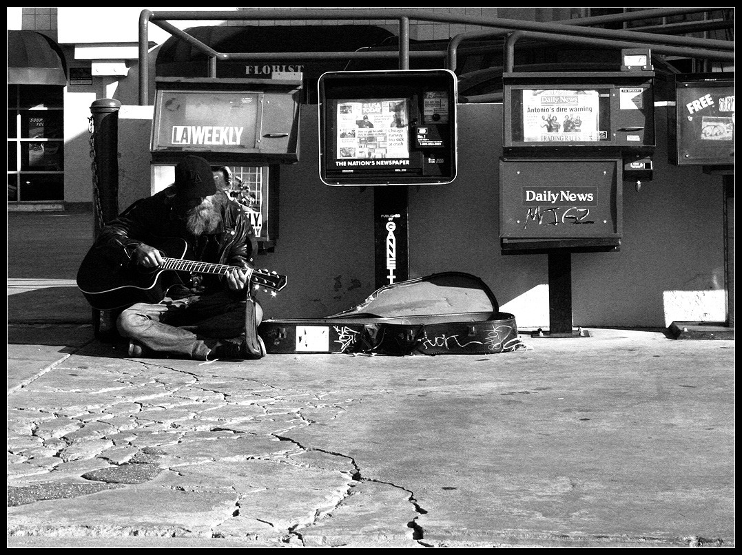We were in town and had stopped for a snack. Across the way was this guy with his Ovation roundback, jamming along toDire Straits and Springsteen songs. I put some money in his tin after the shot.