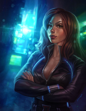 This is a painting I finished up for @ikemann5000 of his OC Jessica!"Her full name is Jessica Pavlin Parker, daughter of tech billionaire Nathan Parker. She was kidnapped and illegally experimented on by a shamed bio and robotics scientist who wanted to make "The perfect human" which is how she got her nano-tech limbs. For a while she was brainwashed and believed she was a prototype android. But once her memories came back she broke free and had to fight those that made her. Her family was murdered during the kidnapping and now she has inherited her father's company which she uses to fund her hero work." I had an absolute blast with the pose and the lighting on this one.