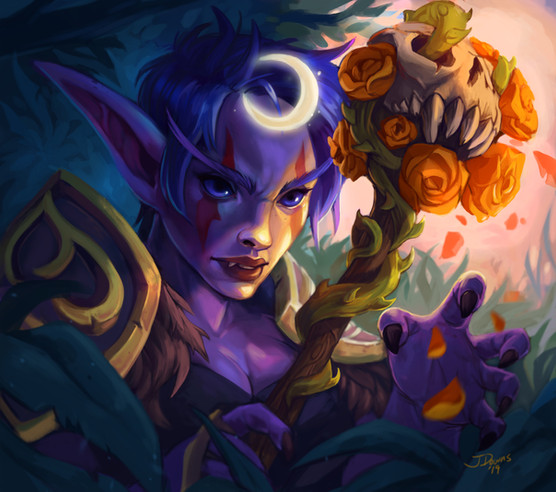 Portrait commission for SKYLARIA _enjeru of her Shadow Priest Draenei Narsiri. Narsiri wields the Staff of Deserved tranquility which has rose petal FX in game, which I thought was super rad! So I had to include it in the image! I really enjoyed trying to push the motion and energy in this mage so it didn't feel as static. And who doesn't love painting a pretty lady with horns haha!Related content