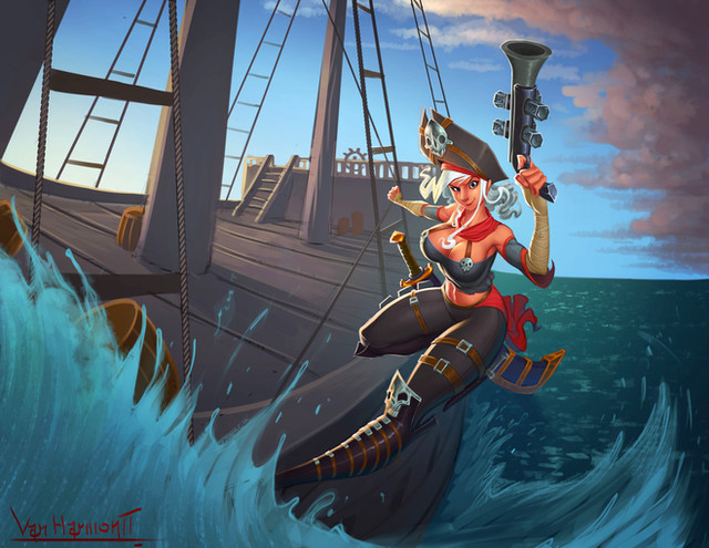 Last week I was working on a steampunk pirate illustration on stream. We raided Dzikawa after my stream ended who commented that the girl looked like a young Jinx from League of Legends. Of course I immediately had to change directions in the piece and convert it to be Jinx inspired! So, with the stream's help, the next time I worked on this we changed a bunch of things in the image to push it that direction and I'm happy we did because I love how it turned out! I wanted to give her the iconic shark bazooka but instead we opted for a cannon. Think of this as some sort of alternate dimension Jinx where instead of being an orphan in the undercity she is adopted by pirates and given command of her own ship. Of course it wouldn't be Jinx without her trusty bomb monkey haha! This image was such a blast! My favorite part about streaming while working is I can bounce ideas off of the chat and collectively we can push these images in directions I never would have thought of! You should come join our stream sometime! Twitch.tv/stumpyfongoRelated content