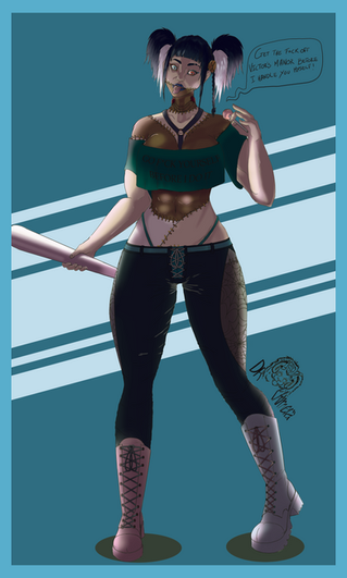 #shorts #blackeyes #boots #darkhair #darkhairedgirl #digitaldrawing #fishnets #fishnetstockings #hairbuns #multicoloredhair #pigtails #robotgirl #tanktop #tattooedgirl #tattoos #uzi #dolljoints