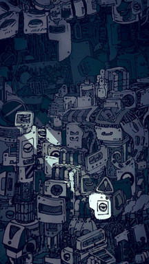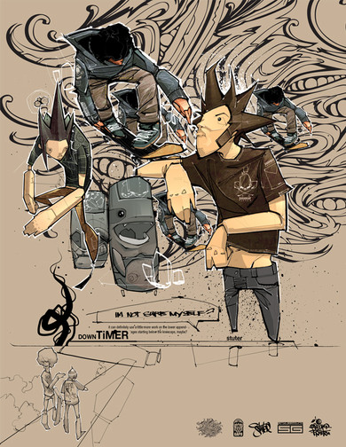 Hand drawn, scanned - 3 hours in PSCS, a little bit of old vector work I did way back and imported into PSCS such as the tagging, logo at the bottom and some of the decalI think the image might be a little confusing, just to let ya'll know, it's a heavily bulky guy with a really small head in an armored suit, I created a zoomed in look on his face, he's supoosed to look like he's screaming in front of his computer wrist ban