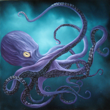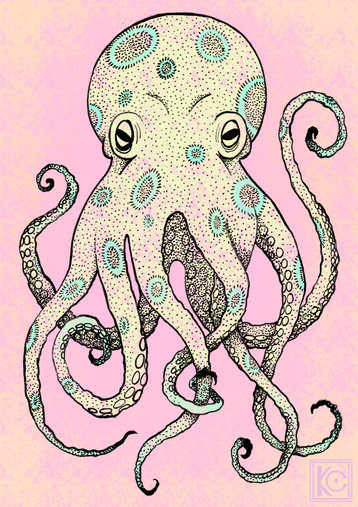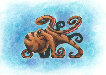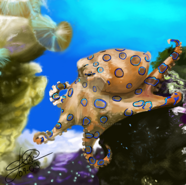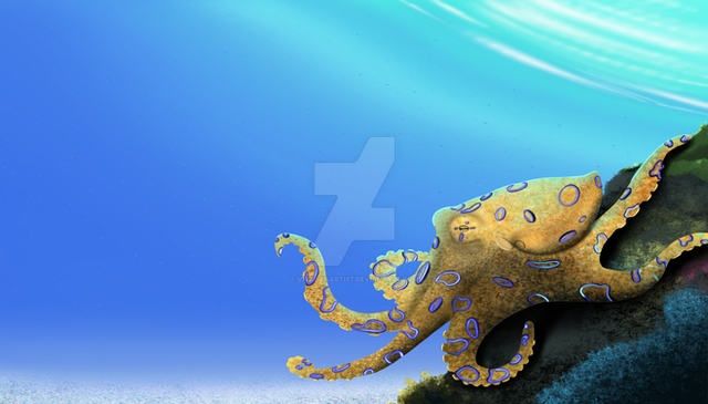 If I ever try to draw another octopus I've given my wife permission to shoot me! Wow it takes along time to draw all those little suction cups! The Blue Ringed Octopus is about the size of a golfball, it has a venom potent enough to kill up to 26 humans, its diet consists of small crabs and shrimp, go figure.EDIT: I went back in and whipped out a quick underwater background and pumped up the chroma of the Blue Rings, they actually glow like neon when the Octopus is about to attack.