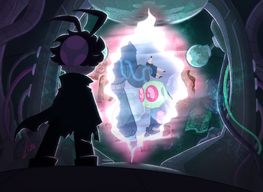 Art trade withThis one was an interesting one! Magnus being a petty bundle of salt and victim of living on an ad infested planet has finally snapped and hired an assassin. But for some reason he'll rather hire one to rid the new CEO of smol mart which was a small store franchise turned HUGE after being purchased by the Irken empire. Too bad he has no idea the assassin is Sadi who plans on probably eating/mauling everyone to death.