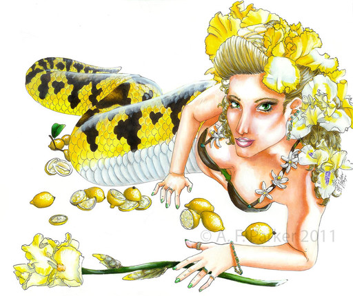 I like the pattern and coloring on the snake body. I like the placement in the composition. Something with the stomach doesn't jive with the body position for me that makes it distracting but not horribly so. Love the blue eyeshadow.