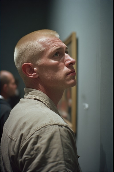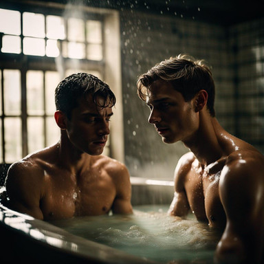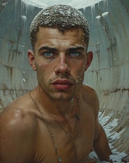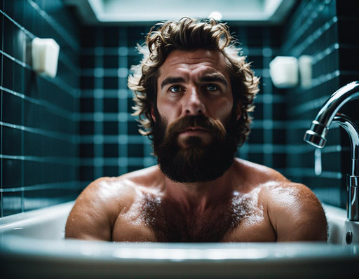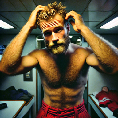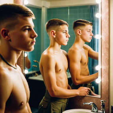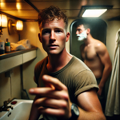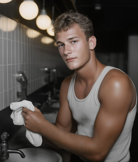 #portrait #body #vintage #filmphotography #bathroom #beard #blonde #digitalart #shaving #shirtless #sweat #youngmale #aiart #blonde_male #ai_photography
