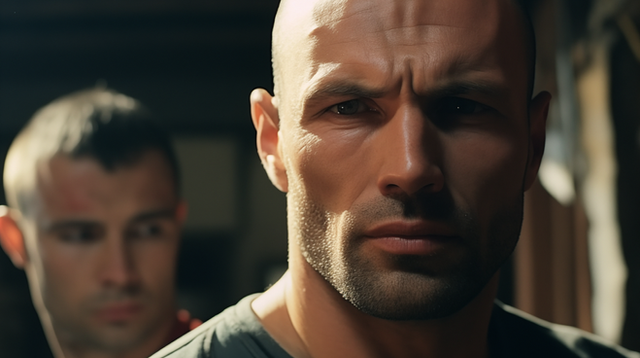 #drama #portrait #bald #baldhead #beard #cinematic #creek #digitalart #sunset #uniform #aiart #aiphotography #ai_photography #cinematic_photography