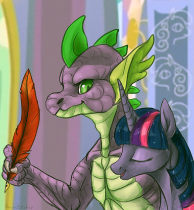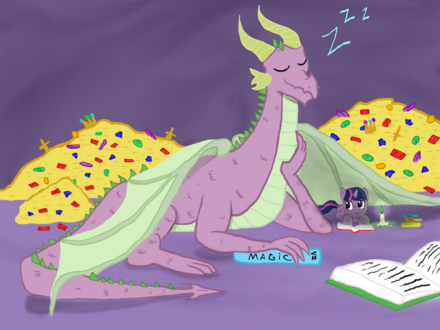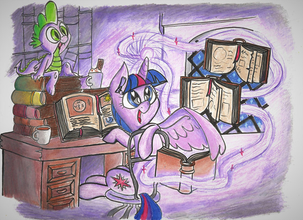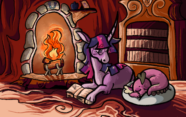 Twilight doing her research with her favorite study companions.Well this took a lot longer than expected. All those pesky candlelit shadows can be pretty time consuming, but I think the end result is quite nice. I would consider Spike to be in his tweenish years in this picture, hence the oversized ears and feet he hasn't quite grown into.