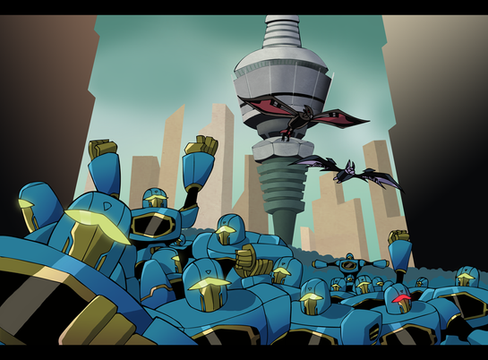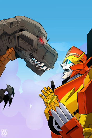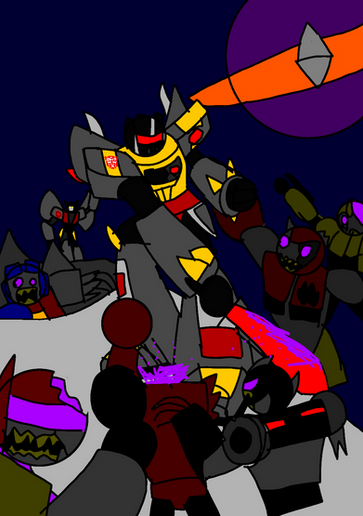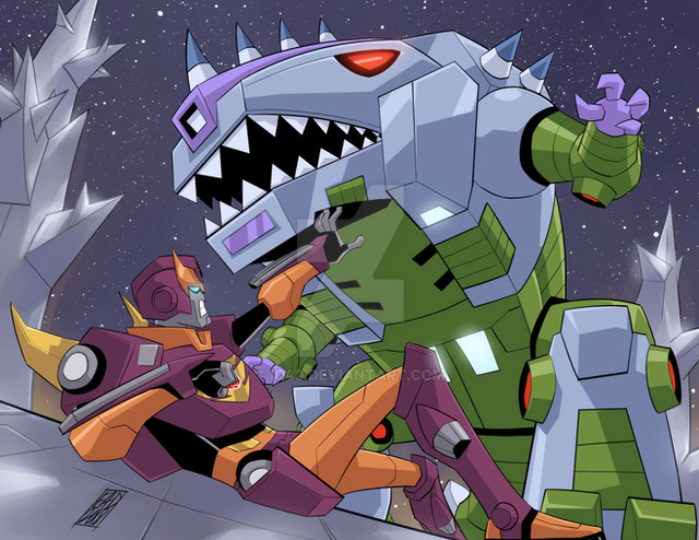 had a challenge/project: take a scene from TF movies (1986, Bayformers) or old G1 comics, and redo it using the TFA style. [link]I chose the 1986 movie and the scene where Hot Rod, Grimlock et al. were against Sharkticons. (Artistic liberties were taken with the background. Translation: I was too damn lazy to draw the original Quintessons' lair.)