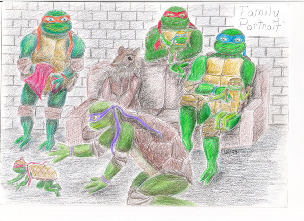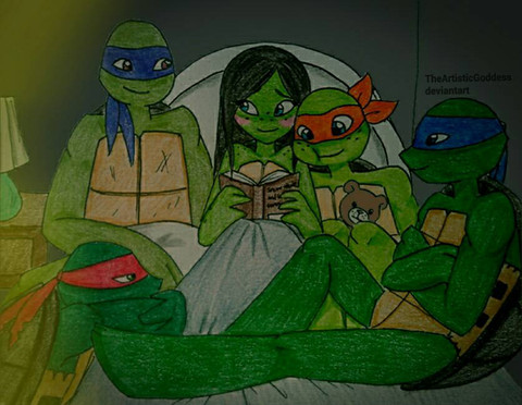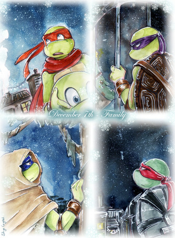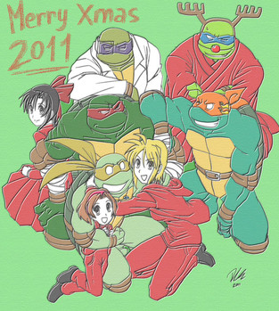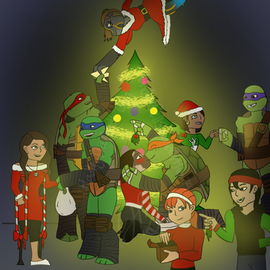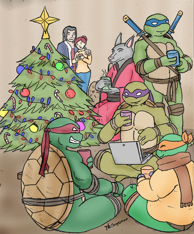 Now- as to what's happening, its late Christmas Eve- and well, Mona and Raph are heading off to bed while still in the living room (no shame...tsk) Mikey has done some sort of maneuver to shield Olivia from the p.d.a before Sam can cover their daughter's eyes, Donny- slightly tipsy on who knows what- turns his head politely to avoid looking, and Leo looks upon the scene bemusedly.