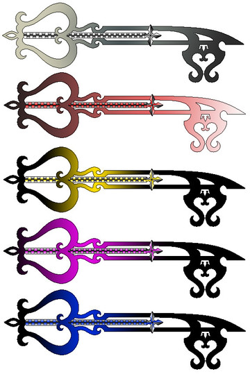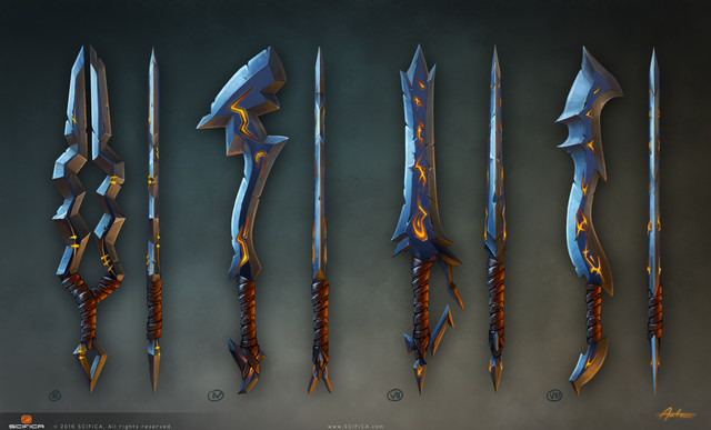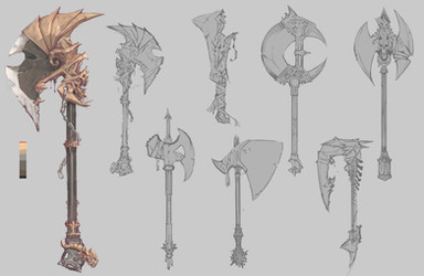 Pretty killer designs! The axe on the far right reminds me a bit of the Dragon King Greataxe from Dark Souls, which isn't a bad thing at all! ^_^