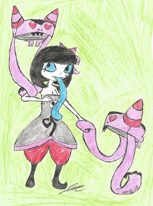 She's a copy ghost (I came up with her before Amorpho came on the scene) and can morph into any ghost or human form. Her partner in crime is her crow Falsetto (AKA "Fall") who changes sound waves so they sound like something else, he's trained to change Mimic's voice to whatever she's copying.